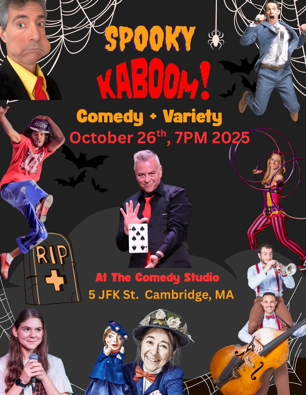 Step right up to the Halloween edition of Kaboom ! Mysterious magic, hilarious gags, insane acrobatics, and virtuosos in crazy skills that you have to see to believe. Kaboom is a show filled with jaw-dropping talents, and wild comedy that you will find nowhere else in New England. Laugh & cheer as you sit crazy close to these one-of-a-kind performers. But don’t touch them, or a performer might land in your scorpion bowl ! A new line-up will entertain you on the last Sunday of every month at The Comedy Studio in Harvard Square.